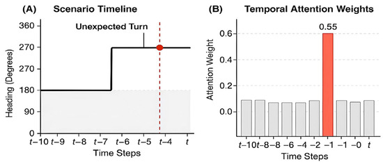 Visualization of Temporal Attention During a Critical Maneuver. (A) Target ship heading timeline showing an unexpected turn at t − 7. (B) Transformer attention weights a current step t. The peak weight (0.55) at t − 7 demonstrates the model’s focus on critical past events.