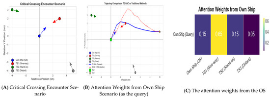 Selective Focus: Figure 7 illustrates the model’s capability to achieve selective focus. In the scenario depicted in Figure 8A, the own ship is in a classic “give-way” situation with TS1, which poses the most immediate collision risk. The attention heatmap in Figure 9B indicates that the model allocated the majority of its attention (0.65) to this critical target. In contrast, the distant and non-threatening vessel (TS3) received a negligible attention score (0.05). This behavior mirrors the cognitive process of an expert human mariner, who would prioritize the most dangerous target while filtering out irrelevant information. This demonstrates that the model has learned a meaningful and efficient attention allocation strategy, rather than simply processing all inputs equally.
