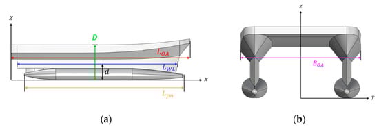 The baseline SWATH vessel design has a displacement of 120 tons and a longitudinal center of buoyancy () at 12.88 m. Figure 1 illustrates various hull views and definitions, including length overall (), waterline length (), ship depth (), pontoon length (), and beam overall (). Table 1 summarizes the vessel’s principal dimensions.