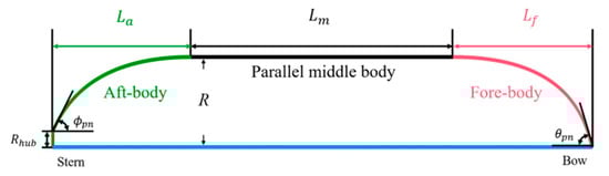 This study proposes a parametric approach for pontoon design, with the pontoon length () fixed at 22.5 m. The design includes four independent parameters: fore-body length (), aft-body length (), fore-body angle (), and aft-body angle (). Two dependent parameters are defined accordingly, including the length of the parallel middle body (), which is calculated based on and as follows: