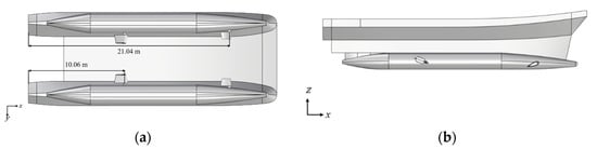 Baseline SWATH vessel with fin stabilizer: (a) Bottom view; (b) Side view.