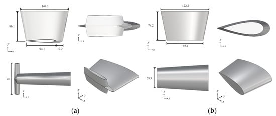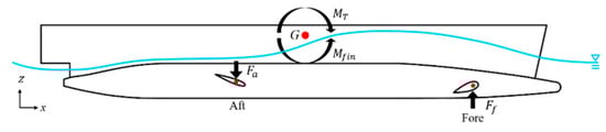 Due to the inherent limitations in longitudinal stability of SWATH vessels, the installation of fin stabilizers is essential to ensure stable operation, particularly at speeds corresponding to a Froude number () greater than approximately 0.7, where dynamic lift and bow-up trim become significant [38]. Figure 3 shows the fin stabilizer arrangement on the baseline design. The fore-fin stabilizer is located 21.04 m from the stern, and the aft-fin stabilizer is located 10.06 m from the stern. Figure 4 shows the working mechanism of fin stabilizers, where is the moment produced by the fin stabilizer to balance the Munk moment. The baseline design is equipped with a control system that only drives the fore-fin stabilizer. During navigation, only the fore-fin stabilizer is an active device, while the aft-fin stabilizer is always parallel to the still-water line. Figure 5 presents the 3D views of the fin stabilizers, with (a) showing the aft-fin and (b) the fore-fin. The fins use symmetrical foil sections: NACA0015 for the aft and NACA0030 for the fore, with aspect ratios of 0.668 and 0.689, respectively. The projected areas are 11,132.73 cm2 for the aft-fin and 7961.66 cm2 for the fore-fin.