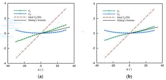 Figure 6 presents the lift and drag coefficients ( and ) for both fin stabilizers. In two-dimensional theory, the ideal lift slope is 2π [39]. The lift coefficient is estimated using Söding’s empirical formula [40]: