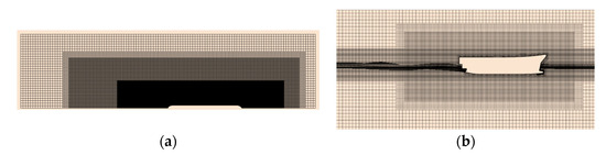 A three-dimensional Cartesian mesh with a base cell size of 1 m is used to discretize the computational domain of free-surface simulation. The initial mesh consists of approximately 3 million cells. To reduce computational cost while accurately capturing the free surface, the adaptive mesh refinement (AMR) module is employed. This module uses the gradient of the volume fraction to locate the free surface and dynamically refines or coarsens the mesh based on the transport equation. With AMR, the total mesh increases to approximately 6.15 million. The AMR setup includes two refinement layers near the free surface and a defined transition width to ensure a smooth gradation from refined to coarse cells. Notably, the surface mesh is not affected by AMR, necessitating sufficient initial mesh density on the hull surface. Figure 9b presents the final mesh of the free-surface simulation on plane .