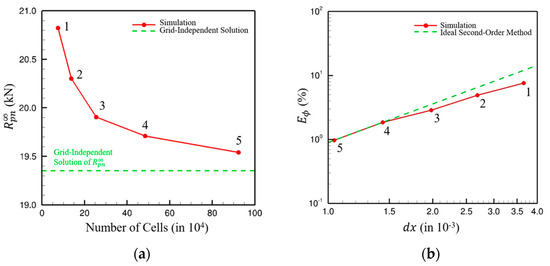 where represents the field variable of interest, denotes the value obtained from the -th grid level, and is the corresponding cell number. In this study, the pontoon’s resistance under fully submerged conditions (), is selected as the target variable for the grid dependency analysis. Figure 10a shows the dependence of the cell number on . Figure 10b illustrates the relationship between the discretization error and the grid spacing . The discretization error closely aligns with that of an ideal second-order scheme. In this study, grid level 3 is adopted, yielding an error of less than 3%.