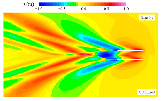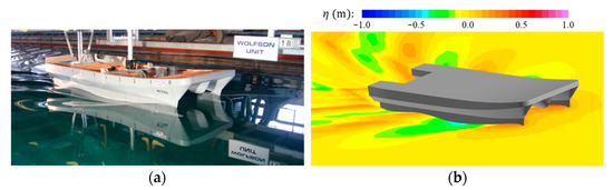 This study validates the numerical simulation approach by comparing full-scale CFD results with experimental data from model tests. The tests were conducted in the Ship Tank, Qinetiq, Haslar, which is 260 m long, 12 m wide, and 5.5 m deep, with a water temperature of 13.2 °C and the model used was built at a 1:12 scale. The towing mechanism and instrumentation were provided and operated by the Wolfson Unit, UK [42]. Due to longitudinal instability observed at Fr = 0.8 during testing, a lower speed of 10 knots (Fr = 0.34) is selected for validation. Table 5 presents the comparison of total resistance and vessel attitude between the CFD simulation and the experimental results. The center of gravity (CG) of a SWATH vessel plays a crucial role in determining running trim () and resistance. As the experimental CG location was not reported, this likely contributes to discrepancies in trim and resistance between CFD predictions and model tests. Despite the nontrivial resistance deviation, the predicted free-surface pattern aligns well with experimental observations, as illustrated in Figure 11.