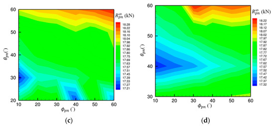 Figure 12 presents resistance contour plots for four representative groups with fixed fore- and aft-lengths—Groups 7, 25, 37, and 43—under fully submerged conditions. The results indicate a general trend: resistance increases with larger fore- and aft-body angles and decreases with smaller angles. Most groups, such as Group 7, display a single low-resistance region, while others exhibit two or three, suggesting multiple optimal configurations. Although small angles generally yield lower resistance, some optimal solutions involve moderate or relatively large angles, highlighting the nonlinear nature of the resistance response.