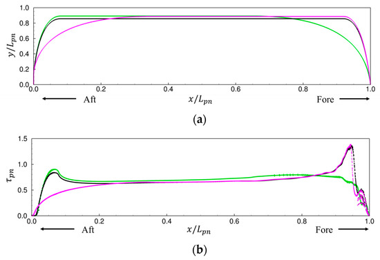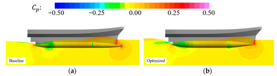 Figure 13a,b present the normalized profile lines and shear stress distribution of three representative pontoons with varying fore- and aft-lengths but identical fore-body and aft-body angles. The fore- and aft-lengths are normalized by . Variations in length significantly influence hull shape: shorter lengths produce blunter profiles, while longer lengths result in sharper, more streamlined forms. Case 3, with the shortest fore-length and longest aft-length, exhibits a blunt bow and sharp stern, whereas Case 1, with the opposite configuration, shows a sharp bow and blunt stern. As summarized in Table 7, cases with shorter fore-sections tend to exhibit lower total resistance, highlighting the importance of fore-body design in hydrodynamic performance.