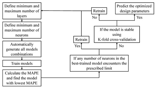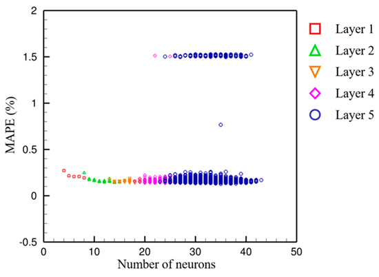 In this study, the input consists of four pontoon design parameters, and the output is the predicted resistance. Figure 15 outlines the employed DNN framework. The architecture is explored with one to five hidden layers. The first three layers contain 5–9 neurons, while subsequent layers have 3–8 neurons. A total of 10,005 model configurations are evaluated to identify the best-performing model. If the optimal model reaches the preset bounds, the search space is expanded for retraining. Model accuracy is assessed using the mean absolute percentage error (MAPE), defined as: