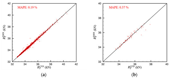 To generate the training dataset, 1398 CFD simulations were performed, each requiring approximately 15 min, resulting in a total of around 349.5 h of computation. These CFD results were used to train the DNN model over 10,005 configurations, which took approximately 24 h. Once trained, the model can predict resistance for new pontoon designs in under 3 min, enabling rapid evaluation and significantly reducing the need for additional CFD simulations. This integration of CFD and deep learning significantly enhances computational efficiency and scalability, offering a practical approach to hull form optimization that would be computationally prohibitive using CFD alone. Figure 16 presents the relationship between the total number of neurons in the hidden layers and the corresponding MAPE values. Each color denotes a different number of hidden layers. In general, increasing the number of neurons and layers tends to reduce the minimum achievable MAPE. However, a larger network does not always result in improved accuracy, indicating diminishing returns or possible overfitting beyond a certain model complexity. The best-trained model consists of five hidden layers with six, eight, nine, eight, and seven neurons, respectively. To evaluate model robustness, K-fold cross-validation is applied. The dataset of 1398 samples is divided into nonoverlapping folds. The model is trained on folds and tested on the remaining fold, repeating this process k times. The resulting MAPE values from each fold, listed in Table 8, are used to assess the model’s stability. After K-fold cross-validation, the finalized model was applied for prediction and parameter optimization. The model was trained on all 1398 data points from the original database, achieving a MAPE of 0.19% (Figure 17a). Additionally, 80 new test samples were used for evaluation, resulting in a MAPE of 0.37% (Figure 17b).