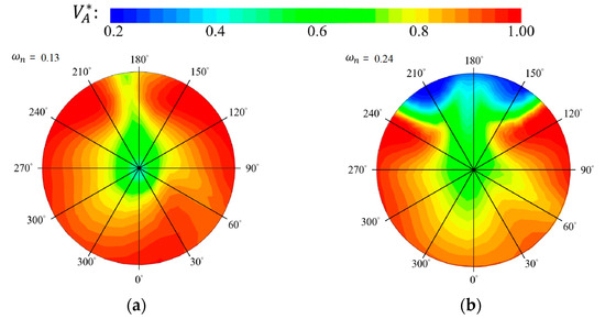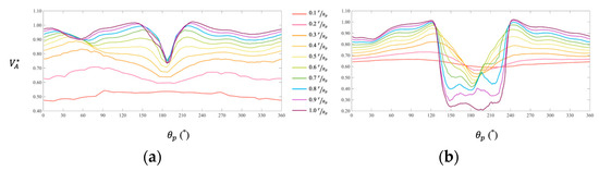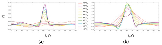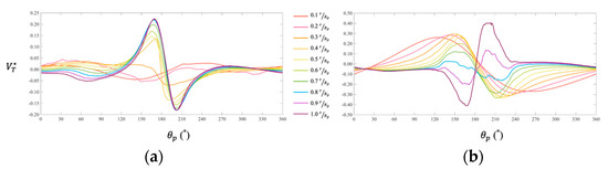 Dimensionless tangential velocity () vs. azimuthal angle (): (a) Baseline; (b) Optimized.