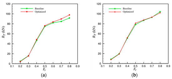 Comparison of total resistance between baseline and optimized designs: (a) Bare hull; (b) Hull with fin stabilizers.