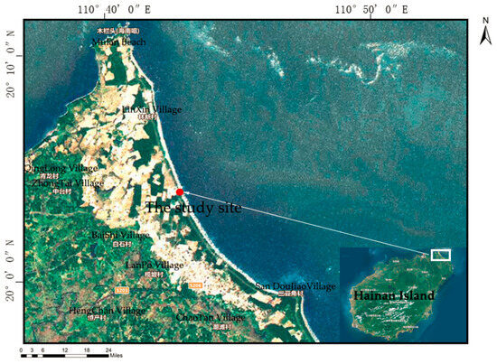 Hainan Island is the second-largest island in China, located in the northern part of the South China Sea and situated on the northern edge of the tropics. Hainan Island has a tropical monsoon climate, with high temperatures and heavy rainfall throughout the year, distinct dry and wet seasons, and significant oceanic regulation. The annual average temperature is 22–27 °C, with an average of 16–21 °C in the coldest month (January) and an average of 28–35 °C in the hottest month (July). The annual precipitation is 1500–2500 mm, with more rain in the east and less rain in the west. The rainy season (May–October) accounts for 80% of the annual precipitation, with typhoons and rainstorm. The dry season (November–April) sees little precipitation and ample sunshine [54]. In total, 6–8 typhoons affect Hainan every year, mostly from July to October, bringing strong winds, rainstorms, and storm surges. The study area is located in Mulan Bay on the northeast coast of Hainan Island (Figure 1), which is a typical coastal sandy landform and one of the areas with the most typhoon landings in Hainan [55]. This study selected typical coastal sandy landforms where the natural state of open terrain exists without human intervention, with vegetation coverage that meets the average level of the region and continuously observed sand movement to explore how sand wind activity affects infrastructure and coastal landform.