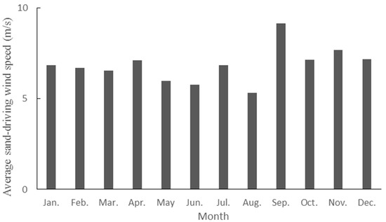 Sand-blowing wind is an important indicator for studying the intensity of sand activity in a certain area. According to the meteorological data for Mulan Bay from 2020 to 2024 (Figure 2), the average annual sand-blowing wind speed in the study area was 6.84 m/s, the highest speed appeared in September (9.13 m/s), and the lowest speed appeared in August (5.31 m/s). There is an obvious windy season in this area, as from September to April, the average sand-blowing wind speed was 7.28 m/s. The low-wind season is mainly concentrated in summer, as from May to August, the average sand-blowing wind speed was 5.97 m/s.