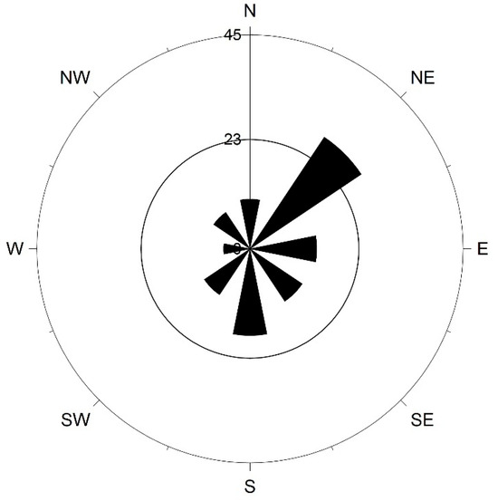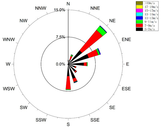 The wind direction determines the direction of sand movement, crucial for studying sandy landforms. An analysis of meteorological data for Mulan Bay from 2020 to 2024 showed that the frequency of annual sand-blowing wind (frequency of occurrence) in this area was 51.54%. The region is mainly dominated by easterly (NE, ENE) and southerly (S, SSE) winds, accounting for 23.13% and 12.58% of the annual wind direction, respectively. The highest sand-blowing wind frequency was found for the NE direction (13.80%), while the frequencies of the SSW, SW, WSW, W, WNW, NW, and NNW directions were all less than 0.3% (Figure 3).