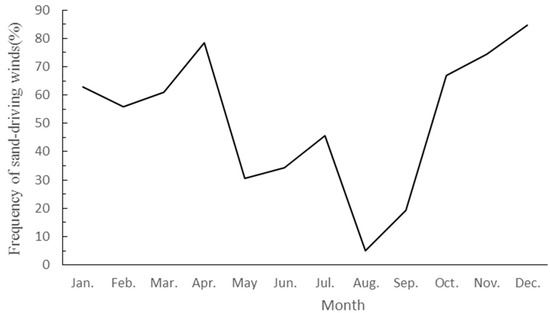 The monthly sand-blowing wind direction in the area is consistent with the annual sand-blowing wind direction. Analyzing the frequency and direction of sand-blowing wind in each month (Figure 4 and Figure 5) shows that the highest sand-blowing wind frequency appeared in December in this region (84.68%). The NE direction was the dominant sand-blowing wind direction, with a frequency of 47.18%, followed by the ENE direction, with a frequency of 24.73%. The sand-blowing wind frequency exceeded 50% in months such as January, February, March, April, October, and November. The sand-blowing wind frequency in January was 62.90%, and the dominant wind direction was northeasterly (NE, ENE, E). The wind frequency in February was 55.75%, and the dominant wind direction was northeasterly (NE). The wind frequency in March was 60.89%, and the dominant wind directions were northeasterly and southerly (NE, SSE, S). The wind frequency in April was 78.47%, and the dominant wind direction was southerly (SSE, S). The wind frequency in October was 67.07%, and the dominant wind direction was northeasterly (NE, ENE, E). The wind frequency in November was 74.44%, and the dominant wind direction was northeasterly (NE, ENE). Finally, the sand-blowing wind frequency was relatively small from May to August, with August having the lowest wind frequency (4.97%), and the dominant wind direction was southeasterly (E, ESE, SE, SSE, S).