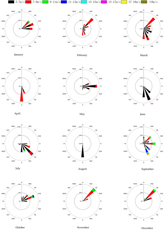 The distributions of the frequencies of sand-blowing wind from January to December at Mulan Bay (2020–2024).