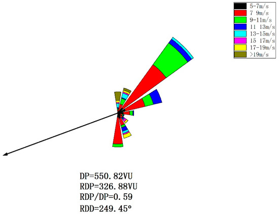 The resultant drift potential (RDP) represents the intensity of net aeolian transport within a year. The yearly resultant drift direction (RDD) represents the net dominant direction of aeolian transport within a year. The RDP and RDD can be calculated and synthesized with regard to the drift potential in various directions based on the frequency of the wind [5].
