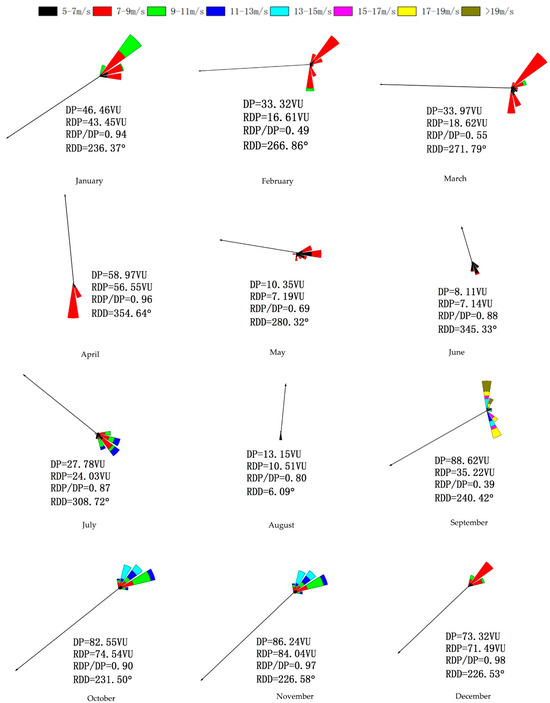 The variation characteristics of drift potential in Mulan Bay have obvious seasonality. Analyzing the drift potential in each month (Figure 7) showed that January, February, March, April, September, October, November, and December were part of the windy season, with drift potential exceeding 30 VU. Among them, the drift potential (88.62 VU) and the resultant drift potential RDP (35.22 VU) in September were the largest, with a directional variability index (RDP/DP) of 0.39. The resultant drift direction (RDD) was 240.42°, occurring in a WSW direction. The resultant drift direction (RDD) in each month of the windy season was mainly southwest. In contrast, the drift potential in each month of the low-wind season (May–August) was less than 20 VU, and the resultant drift direction (RDD) was mainly to the northwest.
