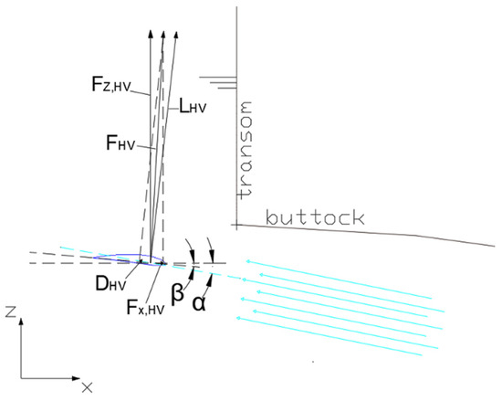 In cases where there is a reduction in total resistance and an improvement in propulsive efficiency, the x-component of the lift vector is greater than the drag vector of the same component. Lift generated by the Hull Vane® causes the hull to lift aft, decreasing the wet surface area, resulting in reduced frictional resistance. Another feature of Hull Vane® as an energy-saving device is the ability to correct vessel trim. Trim correction, more specifically, its reduction affects the total resistance reduction at higher speeds since the force in z-direction proves to have a large influence on the vessel’s overall trim and hence, its total resistance [7,10,11]. Referring to Figure 1, the force on the z-axis can be estimated using: