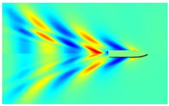 Wave pattern of a 55 m supply vessel at 20 knots, which is reproduced from [10]. (Blue portrays a wave through, red potrays a wave crest).