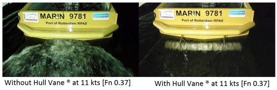 Trim changes affect the Hull Vane® inflow angle, so with a trim reduction, hull performance can be improved. Hull Vane® reduces vessel wave formation, especially towards the stern area. This is due to the creation of a low-pressure region on the top surface of the Hull Vane®. The interaction between this low-pressure region and the transom wave results in a significantly lower wave profile [10]. This effect can be seen in Figure 2. This reduction in wave formation leads to a decrease in wave-making resistance.