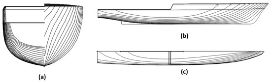 (a) Body plan of the patrol vessel, (b) profile plan of the patrol vessel, (c) half-breadth plan of the patrol vessel; the body plan of this patrol boat is readily available in the open-source library.