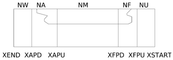 In the grid independence study (GIS), the XGRID command is modified to control the grid cell distribution. The commands ‘etamax’ and ‘zetamax’ adjust the number of planes in the circumferential and radial directions, respectively. The commands ‘nu’, ‘nf’, ‘nm’, ‘na’, and ‘nw’ adjust the number of planes (clusters) in the longitudinal direction, whereas ‘xend’, ‘xapd’, ‘xapu’, ‘xfpd’, ‘xfpu’, and ‘xstart’ determine the position of the flow stream as illustrated in Figure 5. These seven commands are changed for every subsequent simulation to increase grid cells (Refer to Appendix A.5).