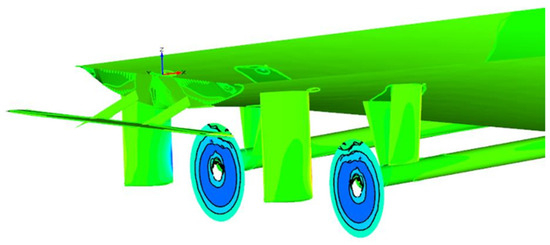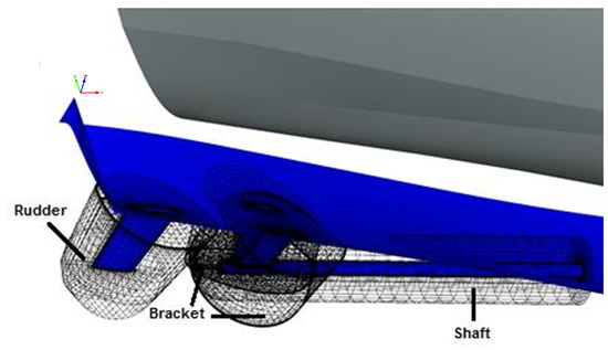 Three-dimensional view of appendages fitted to the hull. The green color represents the hull and the appendages i.e., brackets and rudders, and blue rings representing the propeller plane.