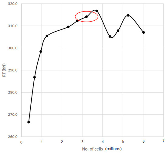This empirical method, developed from regression analysis of extensive model test data, is widely recognized for its utility in the initial design stages of conventional hull forms. While acknowledging that empirical methods inherently carry limitations regarding their universality, the alignment of the patrol vessel’s main dimensions and coefficients with the database underpinning the Holtrop–Mennen method provides a sound basis for its application in this comparative study. It serves as a valuable benchmark for evaluating the CFD results, particularly in the absence of direct experimental data for this specific hull.