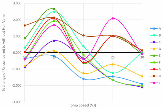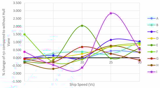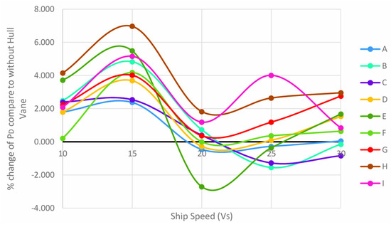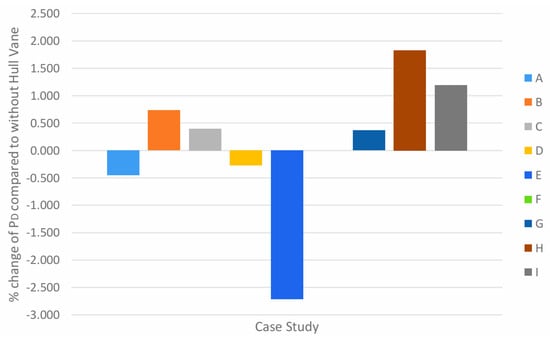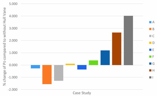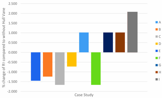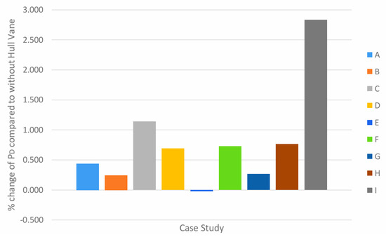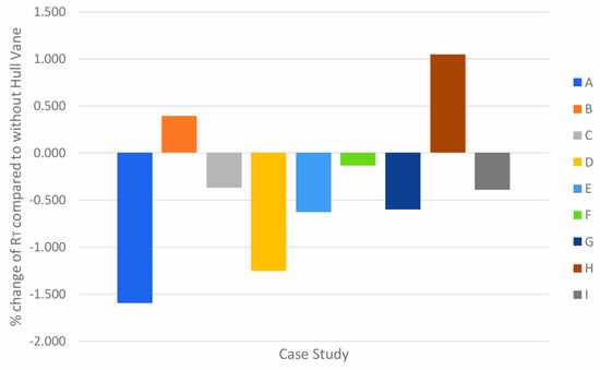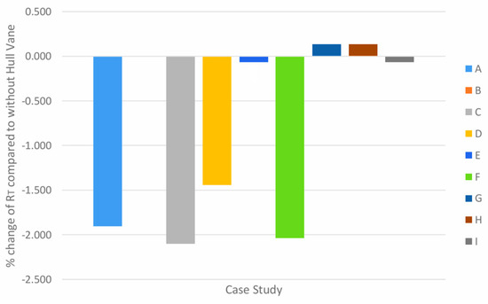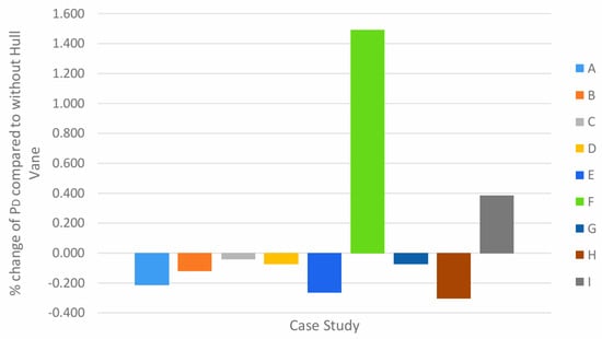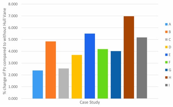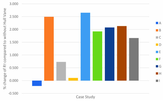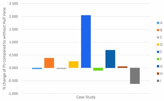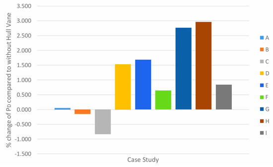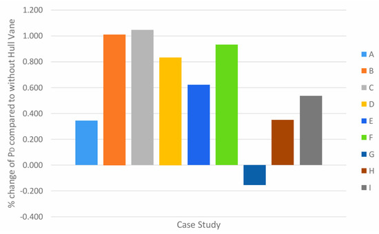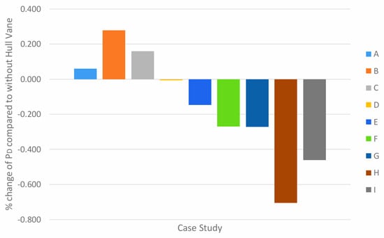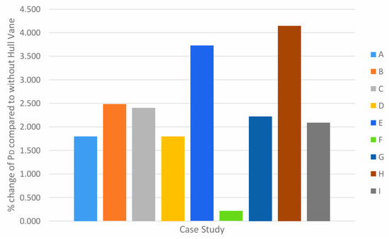 The arrangement that produces the most amount of improvement across all tested speeds is case A, whereby there are only four instances that do not result in a positive improvement. Case C is the most effective arrangement when measuring the most significant percentage reduction of RT at 20 knots and beyond. This arrangement also yielded the largest percentage reduction of −2.104% at 30 knots. In terms of PD improvements, case B produced the greatest reduction at 1.551% since the significant reduction from case E may have stemmed from a systematic error. For ηD, the arrangement that resulted in the greatest improvement is case C at a 1.136% increase. Case H is considered the worst arrangement since there are only three instances where it resulted in an improvement: for ηD at 20 knots and above.
