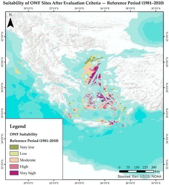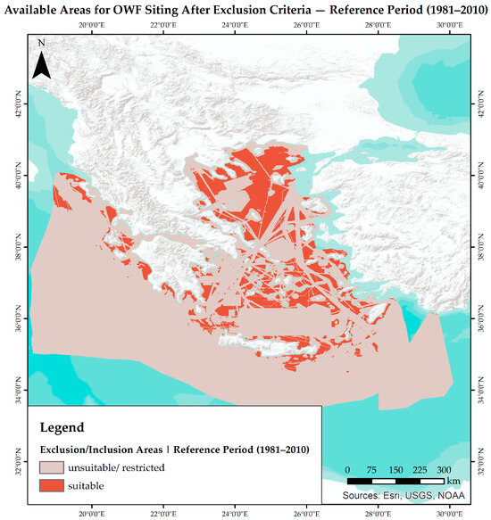 Although the co-location of OWFs and aquaculture sites is an emerging field of research [81,82,83], particularly in EEZs where marine space is limited [84], several significant challenges remain. These include engineering constraints associated with high-energy offshore environments, ecological concerns such as altered hydrodynamic regimes [81] and regulatory complexity stemming from overlapping administrative jurisdictions [85]. Whereas aquaculture is likely to be compatible with OWFs, this will involve setting OWF parks first. The latter is an impactful activity requiring large vessel movement in the area, and then deploying design-for purpose aquaculture areas within the OWF space. Therefore, OWFs cannot be deployed in existing aquaculture areas. In light of these factors, this study excludes all Areas of Organized Development of Aquaculture Activities, as designated by the Greek Ministry of Environment and Energy, from consideration as potential OWF deployment zones, along with an additional 500 m buffer around each.
