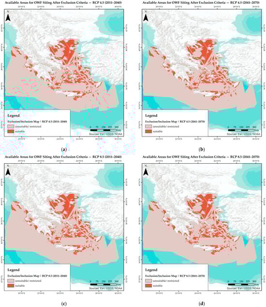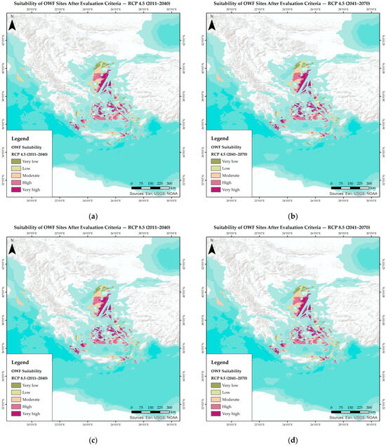 To identify and analyze the legal, technical, environmental, and social characteristics of the Greek EEZ that influence the planning and operation of OWFs, publicly available cartographic data were compiled and analyzed using ArcGIS. The European Marine Observation and Data Network (EMODnet) database [34], where all EU member states are required to submit their official spatial datasets—served as the primary source for data on: (i) bathymetry, (ii) shipping routes, (iii) fishing activity zones, and (iv) military exercise areas. Additional geospatial datasets were retrieved from the THAL-CHOR 2 platform [35], a digital repository developed under the EU-funded Interreg Greece–Cyprus program. These included information on: (v) underwater antiquities, (vi) cultural monuments, (vii) archeological sites, (viii) traditional settlements, and (ix) underwater telecommunications infrastructure. The platform provides access to raw spatial layers and accompanying metadata suitable for integration and geospatial analysis. Underwater electricity cable maps (x) were digitized from an image file available on the official website of the Independent Power Transmission Operator (IPTO) [36]. Spatial layers related to (xi) Natura 2000 sites, (xii) coastal bathing waters, (xiii) airports, and (xiv) human settlements were sourced from GEODATA [37], the official Greek national geospatial information portal. Data on (xv) Important Bird Areas (IBAs) were obtained from the Hellenic Ornithological Society (HOS) [38], and (xvi) Areas of Outstanding Natural Beauty (AONBs) were accessed via the Filotis biodiversity database [39]. Distribution maps of (xvii) seagrass meadows were extracted from [40], and (xviii) Greek port locations were acquired from the European Atlas of the Sea database [41]. Hindcast and projected wind velocity data (xix) were obtained from the Copernicus Climate Data Store [42], and specifically the “CORDEX regional climate model data on single levels” dataset. Wind velocity data timeseries were extracted for the Mediterranean Sea region at a 0.11° × 0.11° spatial resolution and a temporal step of 6 h. They were then processed for three 30-year periods: (a) 1981–2010, (b) 2011–2040, and (c) 2041–2070. These intervals were selected to reflect the typical 30-year design lifetime of OWFs, during which turbines are expected to operate reliably and safely. Moreover, 30-year periods are commonly adopted in climate studies to ensure consistency, statistical robustness, and comparability across datasets. Projections for (xx) sea level rise were also collected from the NASA Sea Level Projection Tool [43] based on the Sixth Assessment Report (ASR6) the Intergovernmental Panel on Climate Change (IPCC) [44]. Sea level rise (SLR) data were then reported as a distinct value, considered as the average of the median values for the whole Greek pelagic region, for the two future periods: 2011–2040 and 2041–2070 which was then added to the water depth of the historical period. To assess the impact of climate change on OWF site selection, values for annual average wind velocity and water depth were adjusted according to two Representative Concentration Pathway (RCP) scenarios: (i) RCP 4.5, representing a moderate emissions pathway where CO2 emissions peak around 2040 and subsequently decline, and (ii) RCP 8.5, a high-emissions scenario assuming continued growth in greenhouse gas emissions throughout the 21st century. The combination of the two time periods with the two RCPs yielded four (4) distinct future OWF site selection scenarios, enabling an assessment of climate change effects under both medium- and high-emission trajectories. Examples of raw data used in the analysis are presented in Figure S2a–d.
