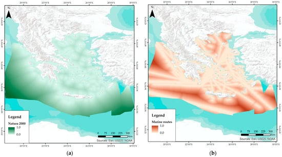To ensure the safety of the maritime traffic and prevent conflicts with existing marine uses, OWFs should be located at a safe distance from established shipping routes [51,94]. Accordingly, candidate OWF sites situated in close proximity to major shipping lanes are assigned lower suitability scores in the analysis.