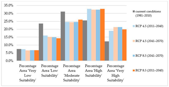 Wind velocity is a critical parameter in the selection of suitable OWF sites as it directly influences both energy production potential and the economic viability of a project. Typically, the minimum wind speed at which a wind turbine begins to generate electricity (i.e., cut-in speed) is approximately 4 m/s at turbine hub height [48]. However, a minimum threshold of 6 m/s in average annual wind speed is generally required to ensure cost-effective operation [21,22,49]. Furthermore, advanced reanalysis data are necessary for accurately evaluating offshore wind energy potential across global EEZs, underscoring their importance in supporting reliable wind resource assessments [50]. In this study, areas with average wind velocity lower than 6 m/s at 100 m above sea level are considered unsuitable and excluded from the evaluation [20,22,51]. While it is recognized that wind turbines have an upper operational limit, commonly referred to as the cut-out wind speed, typically around 25 m/s depending on the turbine model, this factor was not explicitly included in the exclusion framework, as our dataset did not provide maximum or extreme wind values. The annual average wind speeds observed across the study area remain well below critical cut-out thresholds. Future research could benefit from the integration of extreme wind event projections to assess potential risks to operational reliability in high-wind regions. To investigate the influence of climate change on wind patterns, both historical (hindcast) and future (forecast) data were incorporated, covering the periods 1981–2010, 2011–2040 and 2041–2070 under the RCP 4.5 and RCP 8.5 emission scenarios. Since the Copernicus Climate Data Store [42] provides wind speed data at a standard height of 10 m, wind speeds were extrapolated to 100 m, reflecting typical hub heights for modern offshore turbines (approximately 80–120 m). This vertical adjustment was performed using the logarithmic wind profile (Equation (1)), under the assumption of neutral atmospheric stability.
