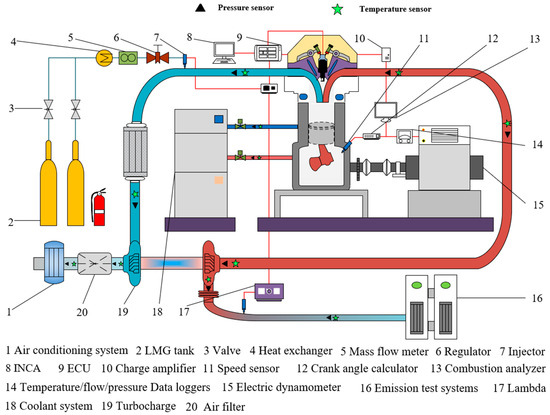 Various sensors were installed on the LME system according to the relevant requirements. The LME test system comprises multiple modules, the primary of which are the bench control system, the combustion collection and resolution module, the air-intake air-conditioning system, the exhaust gas analysis system, the electric dynamometer, and the data acquisition module, etc. The main equipment and accuracy of the bench test are shown in Table 2, and Figure 1 is a schematic of the LME test.