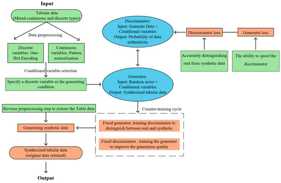 In order to achieve this objective, a further modified GAN model is hereby proposed; namely, the conditional tabular GAN (CTGAN). The model generates data with similar statistical properties by learning the distribution of real data. This is useful for areas such as data privacy, data enhancement, and machine learning applications, and its core function is the same as GAN. Furthermore, the conditional generator of CTGAN facilitates the generation of data that possesses particular discrete values, which can subsequently be employed for the purpose of data augmentation. The working principle of the CTGAN is demonstrated in Figure 2.