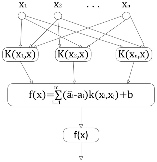 SVM is a machine learning method based on structural risk minimization and statistical learning theory. The algorithm employs a kernel technique to project data into a high-dimensional space for linear analysis. SVM aims to find the best balance between the model complexity and learning performance to optimize the model’s ability to generalize, i.e., to efficiently identify new samples while maintaining a high level of accuracy on the training samples. This property means that SVM performs particularly well in dealing with nonlinear problems on small datasets [42]. The kernel function K is mainly used to simplify the operation in high-latitude space, and the process is shown in Equation (5).
