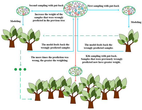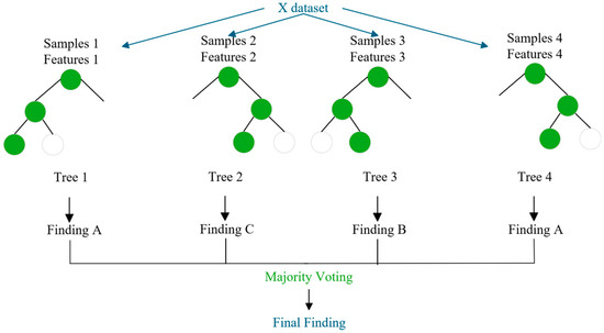 Random forest (RF) is an integrated algorithm that is generally better than a single decision tree. A decision tree implements regression by keeping the MSE as low as possible, and the decision tree makes judgements in each branch and decides on the best outcome. Random forests integrate multiple decision trees and introduce randomness in the extraction of samples and features to obtain the optimal solution by ‘voting’ among multiple decision trees [44]. The RF process is shown in Figure 4.