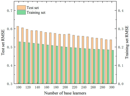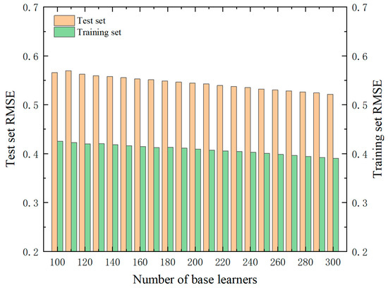 As illustrated in Figure 7, with the augmentation of the number of base learners, the overall RMSE of the test set exhibits an upward trend, accompanied by greater fluctuations, suggesting that the XGBoost model demonstrates a lower level of stability compared to the RF model; however, it exhibits a higher degree of overfitting. The existence of a more extensive optimization space, similar to the aforementioned Bayesian model optimization approach, is revealed.