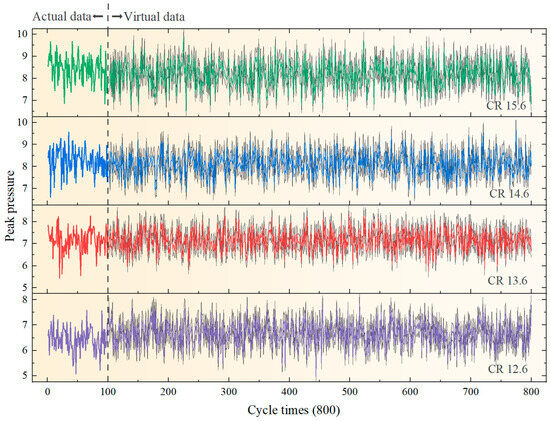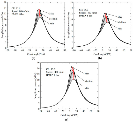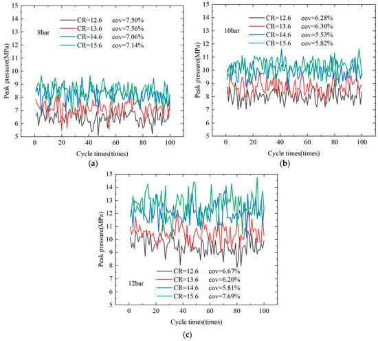 Notwithstanding the numerous advantages of an increased compression ratio, the process can result in premature spontaneous combustion of the mixture. This, in turn, creates a pressure wave within the engine, which can lead to damage and a consequent reduction in the engine’s performance and longevity [33]. As illustrated in Figure 9, the peak pressures were measured for 100 cycles, with CRs of 12.6, 13.6, 14.6, and 15.6 at speeds of 1400 r/min for 8 bar, 10 bar, and 12 bar, respectively.