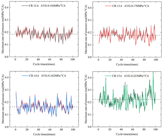 The maximum pressure rise rate is defined as the maximum rate of pressure increase during a given cycle. This rate has proven to profoundly affect the combustion performance and overall efficiency of the engine [51]. Increased CRs are associated with elevated temperatures and pressures of the fuel and air mixture at the termination of the compression stroke. The presence of high temperatures and pressures in this environment has been demonstrated to increase the ignition and combustion rates of the fuel. The acceleration of fuel combustion leads to a rapid increase in pressure over a brief period, thereby enhancing the thermal efficiency and power output of the engine. While a rapid increase in pressure can offer certain advantages, it concomitantly engenders a heightened risk of engine blowout. Premature spontaneous combustion of the fuel and air mixture may result in an uncontrolled combustion process in engines with relatively high compression, leading to the formation of a high-amplitude pressure wave. This process is known as engine knock.