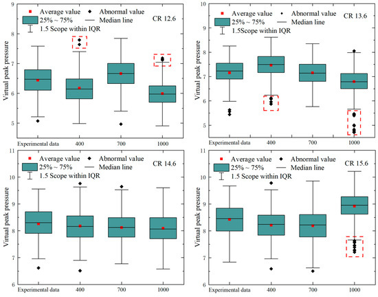 The generation of 400, 700, and 1000 virtual dataset was achieved by employing the CTGAN method, utilizing peak pressures from 100 bench tests conducted at a speed of 1400 r/min and under an operating condition of 8 bar, with CRs of 12.6, 13.6, 14.6, and 15.6.A box-and-line diagrams of the experimental and virtually generated data shown in Figure 11. A comparison of the primary parameters presented in the figure can be found in Table 9.