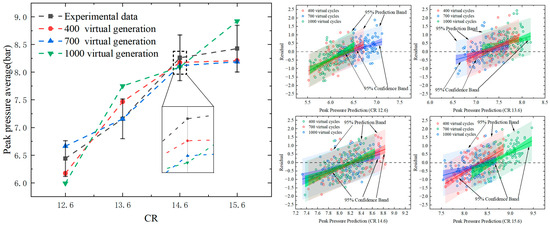 A consideration of both the mean trend line graph and the residual scatter plot reveals that the data of 1000 virtual cycles exceeded the range of the mean error bars of the original data on two occasions. Furthermore, the distribution was found to be non-random at a CR of 13.6. This suggests that the model may be biased. Although the data from 400 virtual cycles falls within the error bars, the residual scatter plot exhibits a greater number of outliers than 700 virtual cycles, thereby compromising the robustness of the model. The mean error values for the 700 virtual cycles demonstrate a high degree of similarity with regard to trends when juxtaposed with the mean error values for the original dataset. Moreover, the residual values appear to be randomly distributed around the zero-line, thus indicating the absence of any discernible pattern in their distribution. It is also noteworthy that no outliers are observed, with no substantial residuals recorded. This result indicates that the model with 700 virtual cycles may not have significant errors. Additionally, there is an absence of discernible heteroscedasticity, with the scatter of residuals exhibiting comparable degrees of variability across various levels of predicted values.