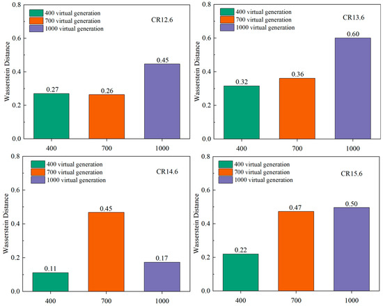 Wasserstein Distance is a measure of the difference between two statistical distributions. In recent years, Wasserstein Distance has become increasingly popular in machine learning and data science due to its stable and geometric intuition [53]. Compared with KL divergence and JS divergence, Wasserstein distance can still reflect the distance between two distributions even if they do not overlap [54]. To quantify the quality of virtual data, we calculated the Wasserstein distance between 400, 700, and 1000 virtual generations compared to real data at different CRs. The results are shown in Figure 13.