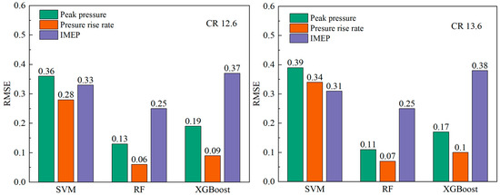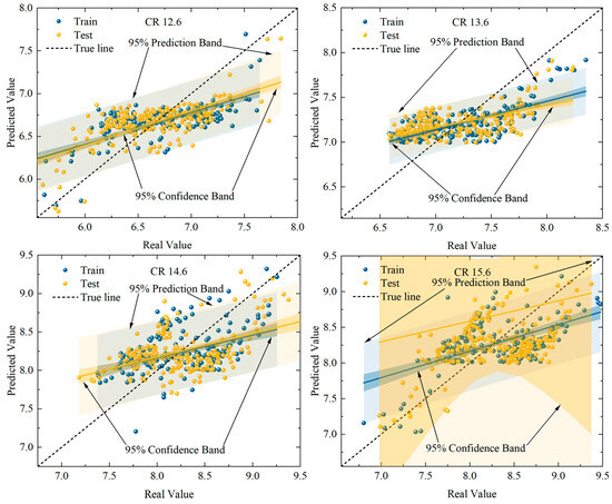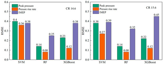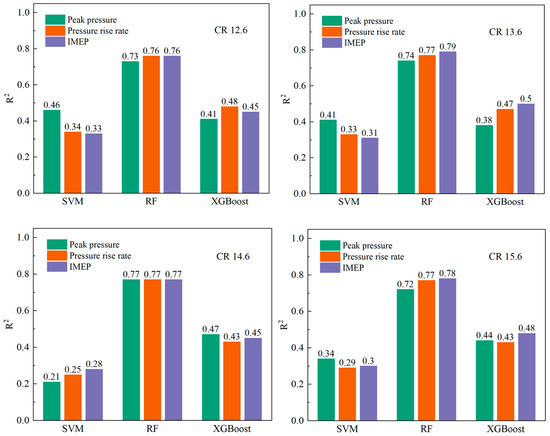 The results of the metrics for its training set at varying CRs were obtained by training the other observables (pressure rise rate, IMEP), as illustrated in Table 11. It has been observed that different CRs do not have a significant effect on the prediction of cyclic variations, especially with regard to the accuracy of prediction of peak pressure and IMEP. The data indicates that the four CRs (12.6, 13.6, 14.6, and 15.6) demonstrate superior performance in the majority of cases, exhibiting higher explanatory power and enhanced accuracy in prediction. The enhanced complexity of the combustion process at elevated CRs did not exert a substantial negative influence on the predictive performance of the RF model. The prediction results of the RF model have been shown to be both stable and accurate, and robust to outliers.