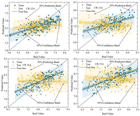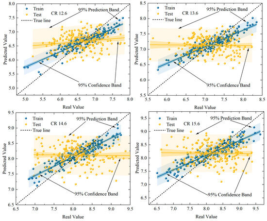 The results of the metrics for the training set at varying CRs were obtained by training the other observables (pressure rise rate, IMEP), as illustrated in Table 12. As demonstrated by the data, lower compression ratios (12.6 and 13.6) have been shown to yield superior outcomes in the majority of cases, exhibiting higher explanatory power and enhanced accuracy in prediction. It has been observed that an increase in CR has a detrimental effect on the predictive performance of the model. The RMSE values of all three metrics at higher CRs (14.6 and 15.6) have been determined to exceed those at lower CRs. This phenomenon may be attributed to the augmentation in complexity of the combustion process at higher CRs.