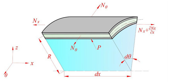 The basic membrane shell theory is applicable for analyzing the dynamics of a liquid-filled pipe wall in the context of long wave propagation. For long waves, the wavelength (λ) is much larger than the pipe radius (R, i.e., λ >> R), such that radial deformation is negligible, and bending stresses and moments have minimal influence on the overall dynamics. This approach thus emphasizes in-plane stresses (axial and circumferential) while neglecting bending effects, as noted by Tijsseling et al. [