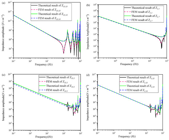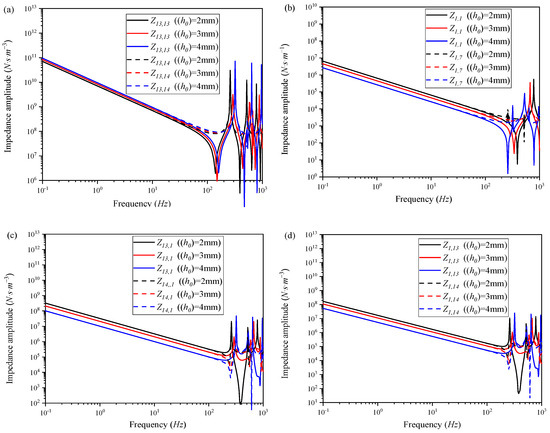 h0 leads to a decrease in the resonance and anti-resonance frequencies of mechanical impedance. Conversely, the frequencies for acoustic impedance, acoustic–mechanical, and mechanical–acoustic impedance increase. Within the low-frequency domain, a progressive increase in
