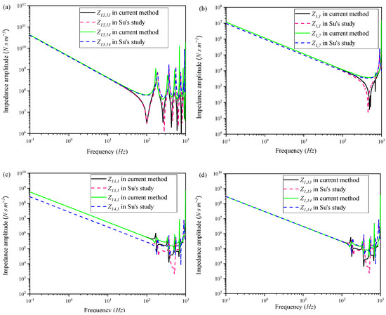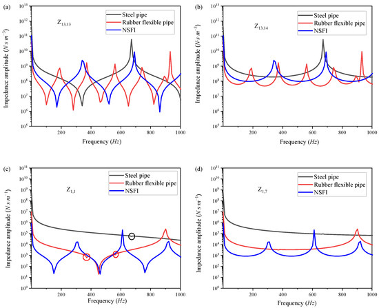 Figure 16 presents a comparative analysis of the impedance characteristics of the NSFI with those of steel pipes and rubber flexible pipes as the parameter h0 approaches h. It is observed that within the low-frequency range, the magnitudes of both acoustic and mechanical impedance for steel pipes surpass those of both the rubber flexible pipe and the NSFI. Notably, while the acoustic impedance of the rubber flexible pipe is lower than that of the NSFI, its mechanical impedance is comparatively higher. Furthermore, the resonance and anti-resonance frequencies associated with steel pipes are elevated relative to those of both the rubber flexible pipe and the NSFI. In the case of rubber flexible pipes, the resonance and anti-resonance frequencies for acoustic impedance are lower than those of the NSFI, whereas the mechanical impedance frequencies are higher. Additionally, the magnitude-frequency curves for mechanical impedance of both steel and rubber flexible pipes display several minor spikes, which can be attributed to the FSI characteristics between the pipe wall and the internal fluid [